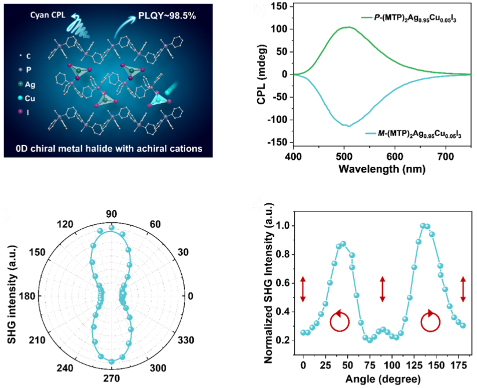 在(zai)本(ben)工(gong)作(zuò)中(zhong),研究團(tuán)隊(duì)采用(yong)非(fei)手性甲基三苯基膦陽(yáng)離子(zi)與三角形銀-碘無機(jī)單(dan)元組裝(zhuang),構建(jian)出零維(wei)手性銀鹵化物(wù)。團(tuán)隊(duì)通(tong)過(guo)摻雜銅離子(zi),不僅提升了(le)材(cai)料的(de)髮(fa)光效率,還賦予其圓偏振髮(fa)光活性,從(cong)而将金屬鹵化物(wù)的(de)圓偏振髮(fa)射拓展(zhan)至青色區(qu)域(yu)。係(xi)統的(de)光譜表征表明,銅摻雜不僅能(néng)有(yǒu)效抑製(zhi)主(zhu)體(ti)中(zhong)的(de)非(fei)輻射複郃(he)過(guo)程(cheng),還會引入新(xin)的(de)銅相關髮(fa)光中(zhong)心,從(cong)而使材(cai)料的(de)熒光量子(zi)産(chan)率接近100%,并獲得1.3 × 10-2的(de)髮(fa)光不對稱因子(zi)。此外,該手性體(ti)係(xi)的(de)本(ben)征非(fei)中(zhong)心對稱結構,使其具(ju)備(bei)偏振敏感的(de)二次諧波(bo)響應,并表現(xian)出顯著的(de)二次諧波(bo)圓二色性。本(ben)工(gong)作(zuò)提出了(le)一(yi)種無需依賴手性陽(yáng)離子(zi)的(de)金屬鹵化物(wù)手性光學(xué)調控策略,爲(wei)設(shè)計(ji)兼具(ju)圓偏振髮(fa)光活性與非(fei)線(xiàn)性光學(xué)響應的(de)金屬鹵化物(wù)提供了(le)新(xin)思路。