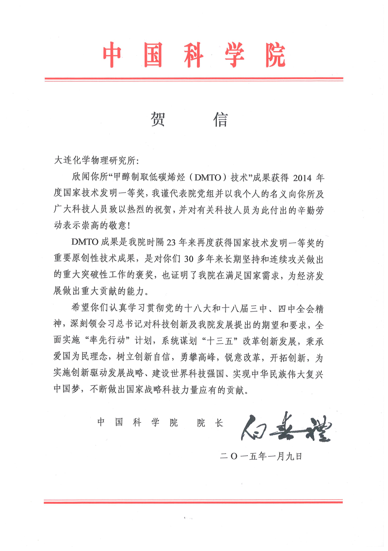 我(wo)所甲醇製(zhi)取低碳烯烴(DMTO)技(ji)術(shù)喜獲國(guo)傢(jia)技(ji)術(shù)髮(fa)明一(yi)等(deng)獎,另有(yǒu)三箇(ge)項(xiang)目(mu)獲國(guo)傢(jia)自然科(ke)學(xué)二等(deng)獎、科(ke)技(ji)進(jin)步一(yi)等(deng)獎